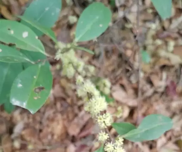 攀援灌木或藤本,稀小灌木,长1—3米;幼枝无毛,老枝具皮孔。叶坚纸质,倒卵形或长圆状倒卵形,长 酸藤子 3—4厘米,宽1—1.5厘米,稀长达7厘米,宽达2.5厘米,顶端圆形,钝或微凹,基部楔形,全缘,两面无毛,无腺点,背面常被薄白粉,侧脉不明显;柄长5—8毫米。总状花序着生于次年无叶枝上,侧生或腋生,长3—8毫米,被细微柔毛,有花3—8朵,基部具1—2轮苞片,花梗长约1.5毫米,被疏微柔毛;小苞片钻形或长圆形,具缘毛,通常无腺点;花4数,长约2毫米;花萼基部连合达1/2或1/3,萼片卵形或三角形,急尖,无毛,通常具腺点;花瓣白色或带黄色,分离,开花时强烈展开,卵形或长圆形,顶端圆形或钝,具缘毛,外面无毛,里面密生乳头状突起,具腺点;雄蕊在雌花中退化,长达花瓣的2/3,在雄花中超出花瓣很多,基部与花瓣连合;花丝挺直;花药卵形或肾形,背部具腺点,雌蕊在雄花中退化或几无,在雌花中较花瓣略长,子房瓶状,无毛;花柱细长,柱头扁平或几呈盾状。果球形,直径约5毫米,光滑,腺点不明显。花期12月至翌年3月,果期4—6月.
