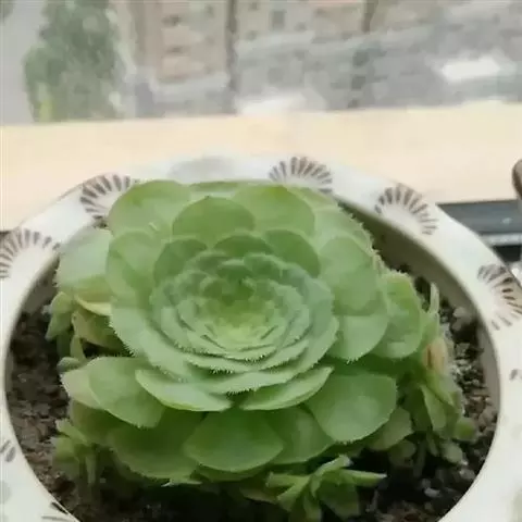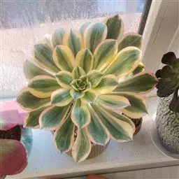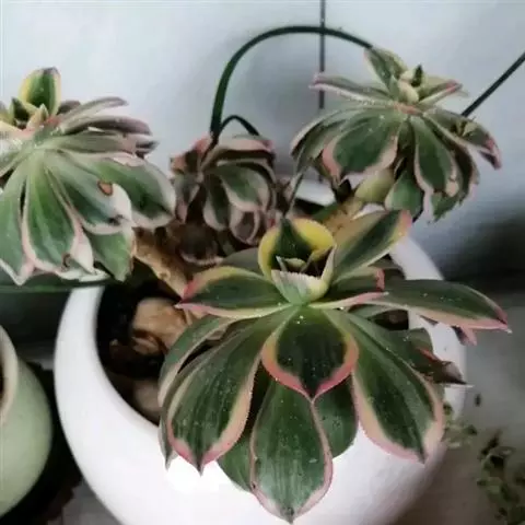 清盛锦别名艳日辉、夕映,为景天科莲花掌属多年生常绿肉质植物。原生地位于大西洋加那利群岛。 植株呈多分枝的灌木状,倒卵形肉质叶在枝头组成较小的莲座状叶盘,叶的中央淡绿色与杏黄色间杂,边缘有红色斑块,叶缘有睫毛状小齿。清盛锦株形秀丽美观,春秋冬三个季节是主要生长季,特别是春秋季节,如果放在户外,温差较大日照较多的环境下,叶片颜色会从金黄转变为红色,色彩绚丽斑斓。而在夏季高温时特别敏感,休眠状态很明显,叶片会不停的干枯掉落,也没有太艳丽的色彩。常用小型工艺盆栽种,装饰窗台、几架、书桌等处,效果很好。