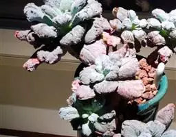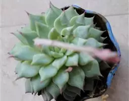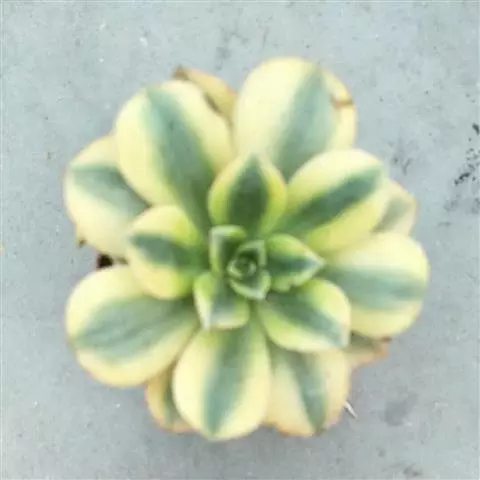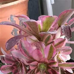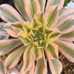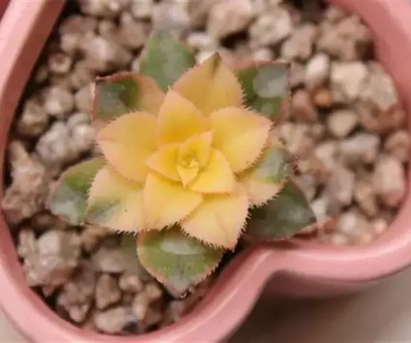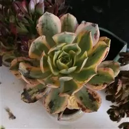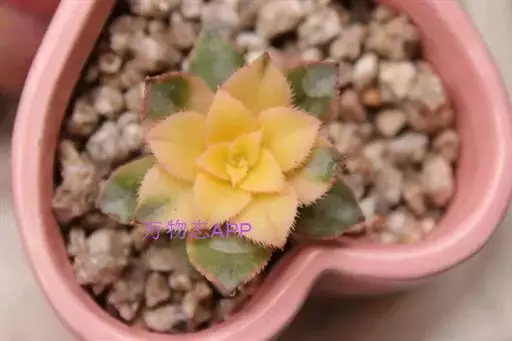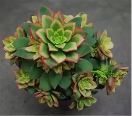清盛锦 植株稍具分枝,叶肉质,呈莲座状排列。叶片倒卵圆形,顶端尖,正面中央稍凹,并具细绒毛,背面有龙骨状凸起,叶缘有睫毛状细锯齿,叶片色彩丰富,中央部分为杏黄色,与淡绿色间杂,外缘则呈红、红褐及粉红等色。