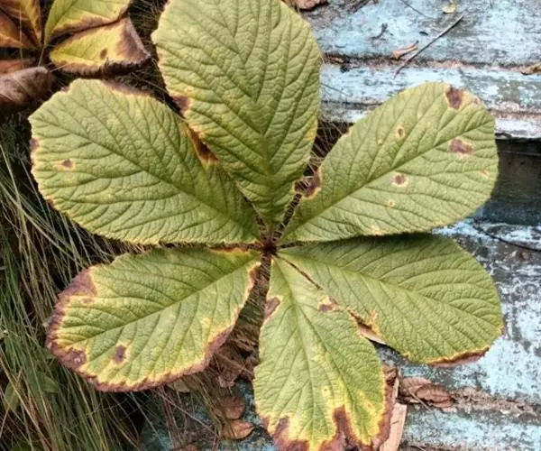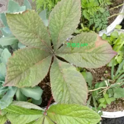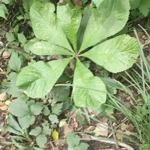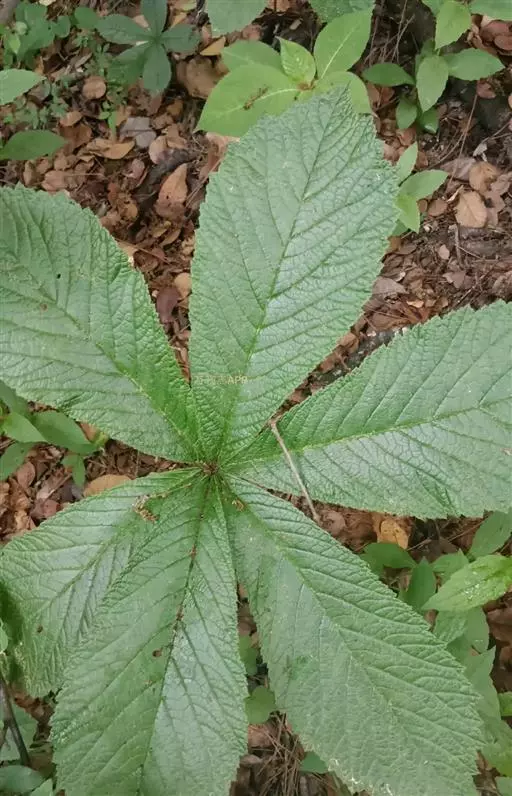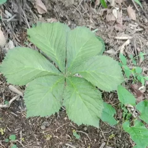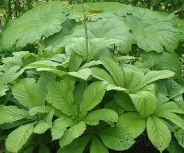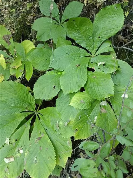 多年生草本,高0.6-1米。根状茎粗壮,横走。茎无毛。基生叶少数,具长柄,为掌状复叶,小叶片5(-7),近倒卵形,长15-35厘米,宽10-25厘米,先端3(-5)浅裂,裂片顶端渐尖,边缘有粗锯齿,腹面无毛,背面沿脉疏生柔毛;叶柄长15-30厘米,疏生柔毛,基部扩大呈鞘状,边缘具长睫毛;茎生叶互生,较小。圆锥花序顶生,长15-30厘米,多花;花梗和花序轴均密被鳞片状毛(有时具腺头);萼片7-5,白色,近卵形,长约2.1毫米,宽约1.1毫米,先端渐尖,腹面无毛,边缘和背面疏生腺毛,具羽状脉,脉于先端不汇合;花瓣不存在;雄蕊通常10,长约4毫米;心皮2,下部合生,子房近上位,卵球形,长约1.5毫米,花柱长约1.3毫米。蒴果;种子多数。染色体2n=30。花期6-7月。