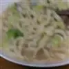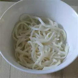 6 面条煮熟后 用网勺捞起 滤其水分 放入碗中的汤裏