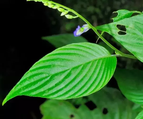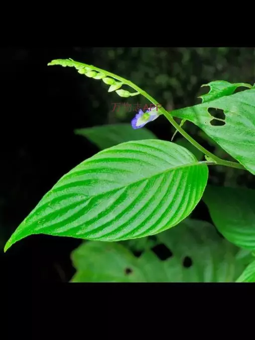 一年生草本。茎高18-40厘米,无毛或疏被短柔毛,分枝或不分枝。叶互生;叶片草质,狭卵形,长4-12厘米,宽2-6厘米,顶端渐尖,基部极斜,一侧近楔形,另一侧近耳形,边缘全缘,上面在边缘之内疏被短伏毛,下面无毛,侧脉在狭侧5-8条,在宽侧8-13条;叶柄长0.5-1.5厘米,无毛。花序长3-12厘米,顶生花序有多数花;花序轴上部以及花梗被极短的伏毛;苞片线形,长2.5-3毫米,无毛,常带蓝色;花梗长1-3毫米。花萼带蓝色,长约5.5毫米,5浅裂,只裂片边缘被短柔毛,其他部分无毛,筒长3.5毫米,裂片三角形,长约2毫米。花冠蓝紫色,长约10毫米,只在内面口部突起处有短毛,其他部分无毛;筒长约5毫米,口部直径1.5-2毫米;上唇长约2毫米,裂片宽卵形或半圆形,下唇长5毫米,椭圆形,3浅裂。雄蕊2,位于前方,无毛,花丝着生于距花冠基部3.5毫米处,线形,长约2毫米,花药长1毫米,2室近平行;退化雄蕊2,位于后方,着生于距花冠基部3毫米处,长约0.8毫米。雌蕊长约6.5毫米,无毛,子房卵球形,花柱长约4毫米,柱头球形。蒴果椭圆球形,长约4毫米。种子长椭圆球形,长约0.3毫米。花期7-10月。