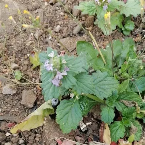 一、二年生草本,平卧或上升,具匍匐茎,长10—20厘米,被白色长柔毛,幼嫩部分尤多,老茎有时紫绿色。基生叶很多,较茎生叶长且大。叶片纸质,匙形或倒卵状披针形,长3—6厘米,宽1.5—2.5厘米,有时长达14厘米,宽达5厘米,顶端钝至圆形,基部渐狭,下延,边缘具不整齐的波状圆齿或浅波状齿或几全缘,两面被疏糙伏毛或疏柔毛,以脉上为密;柄长1—2.5厘米或更长,具狭翅,呈紫绿色或浅绿色。花轮具多花,排列成间断的穗状轮伞花序顶生,顶端的花轮密聚;苞片下部者叶状,向上渐小,披针形。萼漏斗状,具10脉,长5厘米,仅萼齿外面及边缘被疏柔毛,具5齿,齿狭三角形或短三角形,长约为萼的1/2;花冠管状,淡蓝色或淡红紫色,长8—10毫米,外面被疏柔毛,里面仅花冠管被疏微柔毛,近基部具毛环;檐部二唇形,上唇短,圆形,顶端微凹,下唇宽大,中裂片狭扇形或倒心形,侧裂片长圆形或近椭圆形;雄蕊花丝被疏柔毛或几无毛;子房无毛;花盘裂片不明显,前方具1较子房裂片小的蜜腺。小坚果倒卵状三棱形,背部具网状皱纹,合生面占腹面2/3左右。花期3—7月,果期5—11月。