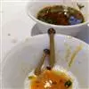 2、米粉,用清水漂过;糊辣椒面,用干辣椒烤脆微糊打成面(不要太碎);泡酸莲白,食用时从泡菜坛里捞出切成小片用小碟装好当做配菜;酸菜,切成1.5-2厘米长段;芜荽节成8毫米左右的段;