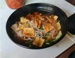 2、把米粉用10℃的水浸两小时,后放入开水锅中煮熟后,捞出放入碗内加入提前备好的汤。