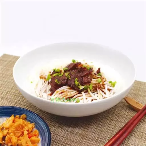 3、食用时按下列顺序操作:米粉(一般一碗牛肉粉约150克-200克)放入开水锅中烫透,捞入汤碗里,在米粉上铺上牛肉片(25克),盖上炖熟的牛肉丁(25克)或牛筋丁,放上适量的酸菜,加上少许牛油,最后浇上滚烫的原汤,洒上芫荽节即可。