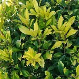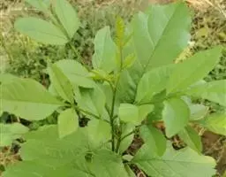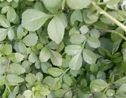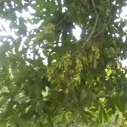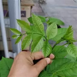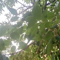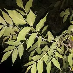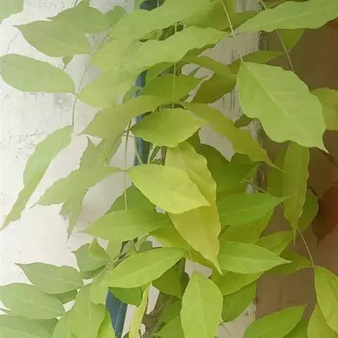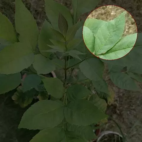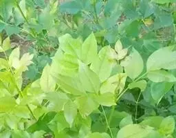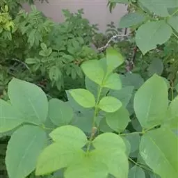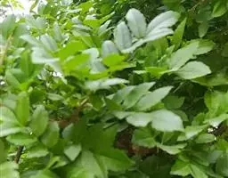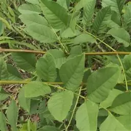 叶:羽状复叶长18-44厘米;叶柄长2-5厘米,基部几不膨大;叶轴圆柱形,上面具较宽的浅沟,密被灰黄色柔毛(变种和一些栽培型常无毛);小叶79枚,薄革质,长圆状披针形、狭卵形或椭圆形,长4-13厘米,宽2-8厘米,顶生小叶与侧生小叶几等大,先端渐尖或急尖,基部阔楔形,叶缘具不明显钝锯齿或近全缘,上面黄绿色,无毛,下面淡绿色,疏被绢毛,脉上较密,中脉在上面凹入,侧脉7-9对,与细脉在下面凸起;小叶无柄或下方1对小叶具短柄。