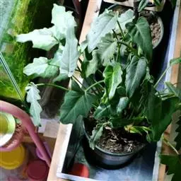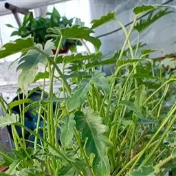 2.盆土缺磷,叶片卷曲,叶色暗绿,下部叶的叶脉间黄化;