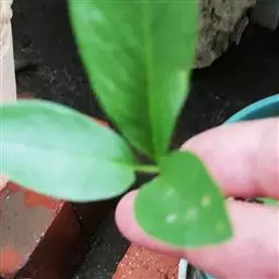 4.盆土缺镁,由下至上叶片边缘和中部失绿变白;