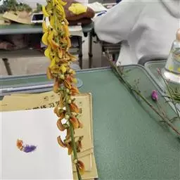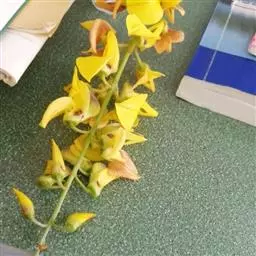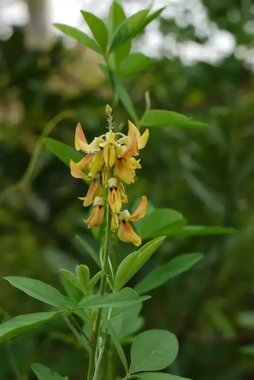 总状花序顶生,有花10-20朵,花序长达20厘米;苞片线形,长2-3毫米,小苞片与苞片同形,稍短小,生花梗中部以上;花梗长3-6毫米,在花蕾时挺直向上,开花时屈曲向下,结果时下垂;花萼近钟形,长4-5毫米,五裂,萼齿三角形,约与萼筒等长,无毛;花冠黄色,伸出萼外,旗瓣圆形,直径约12毫米,基部具胼胝体二枚,先端具芒尖,翼瓣长圆形,约与旗瓣等长,龙骨瓣最长,约15毫米,稍弯曲,中部以上变狭,形成长喙,基部边缘具微柔毛;子房无柄。