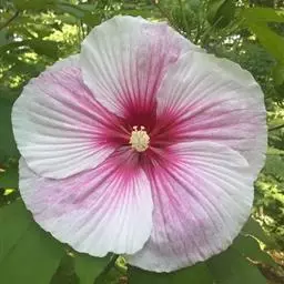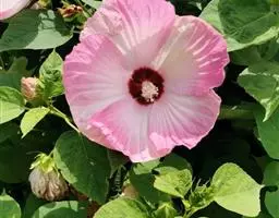 大花秋葵(学名:Hibiscus grandiflorus Michx.)是锦葵科宿根多年生草本植物,高1-2米,落叶灌木状。茎粗壮直立,基部半木质化,具有粗状肉质根。单叶互生,具有叶柄,叶大。花序为总状花序,朝开夕落。花大,单生于枝上部叶腋间,花瓣5枚,有白、粉、红、紫等颜色。花期6-9月。蒴果扁球形,种子褐色,果熟期9-10月。