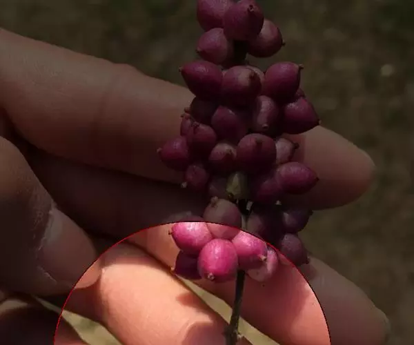 花小,无梗,单生于短小、钻形苞片的腋内,组成一短小的顶生穗状花序,下部的苞片叶状且较长;萼筒长约2毫米,萼齿5枚,卵状披针形,长约1毫米,顶急尖,无毛;花冠白色,钟形,长5-7毫米,裂片卵形,稍短于筒,内外两面均无毛;雄蕊5枚,着生于花冠筒中部,与花冠等长或稍伸出,花药白色,长2毫米;花柱长6-7毫米,无毛,柱头头状。果实卵圆形,长7毫米,顶端有1小喙,蓝黑色,具白霜;分核2枚,密生长柔毛。花期7-9月,果熟期9-11月。