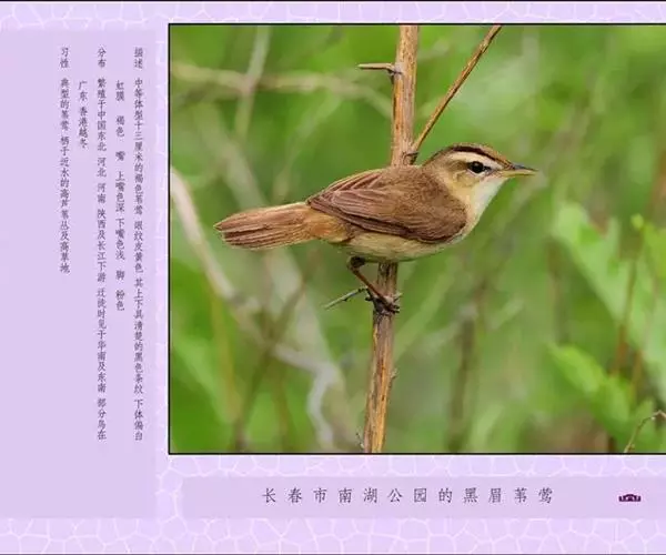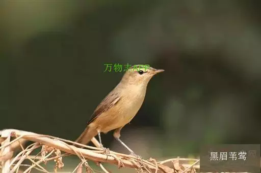 黑眉苇莺(学名:Acrocephalus bistrigiceps):体重7-11克,体长11-13厘米。上体橄榄棕褐色;眉纹淡黄色,杂有明显黑褐色纵纹;第2枚初级飞羽较第6枚短;下体白色,两胁暗棕色。虹膜暗褐色;嘴黑褐色,下嘴基淡褐色;脚暗褐色。