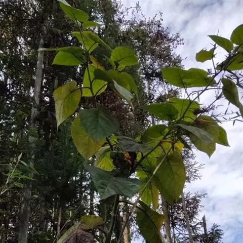 水桐木又名:水同木,哈氏榕,尖刀树。常绿小乔木,树皮黑褐色,枝粗糙,叶互生,纸质,倒卵形至长圆形,长10-20厘米,宽4-7厘米,先端具短尖,基部斜楔形或圆形,全缘或微波状,表面无毛,背面微被柔毛或黄色小突体;基生侧脉短,侧脉6-9对;叶柄长1.5-4厘米;托叶卵状披针形,长约1.7厘米。榕果簇生于老干发出的瘤状枝上,近球形,直径1.5-2厘米,光滑,成熟桔红色,不开裂,总梗长8-24毫米,雄花和瘿花生于同一榕果内壁;雄花,生于其近口部,少数,具短柄,花被片3-4,雄蕊1枚,花丝短;瘿花,具柄,花被片极短或不存,子房光滑,倒卵形,花柱近侧生,纤细,柱头膨大;雌花,生于另一植株榕果内,花被管状,围绕果柄下部。瘦果近斜方形,表面有小瘤体,花柱长,棒状。花期5-7月。