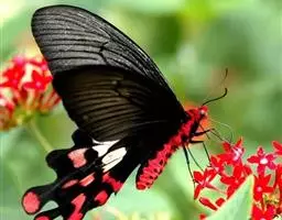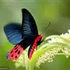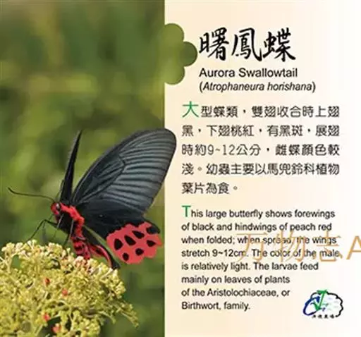 曙凤蝶(拉丁名:Atrophaneura horishana),成虫出现于夏季,生活在中海拔山区。喜访花。本种在局部地区数量不少,但仍被列为保育类昆虫。 曙凤蝶翅展110~130mm,体背黑色,两侧及腹面有红色绒毛。雄蝶翅膀正面黑得发光,有丝绒的质感,后翅背面下半部有曙红色大斑。雌蝶较之雄蝶略大,翅膀正面黑底带些褐色,后翅背面下半部的红色较浅。