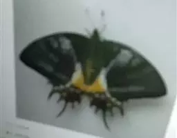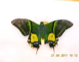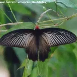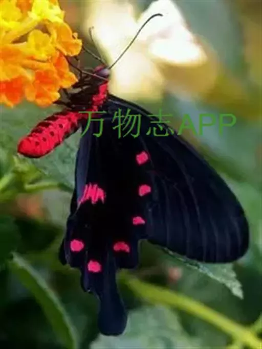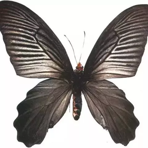 成虫:翅展100—130 mm。 体背黑色,头、颈、胸侧及腹侧具红色鳞毛。雌、雄异型。雄蝶翅黑绒色,后翅的臀缘褶很大,反卷且具灰白色体毛的性标;反面端半部红色,内镶嵌7个黑斑。雌蝶前翅大部及后翅色淡,后翅端半部灰黄色内镶8个黑斑,其中m1室外缘1个不十分清楚;后翅反面端半部浅红色,只镶嵌7个黑斑,因m1室有1个与基半部的黑色相并。
