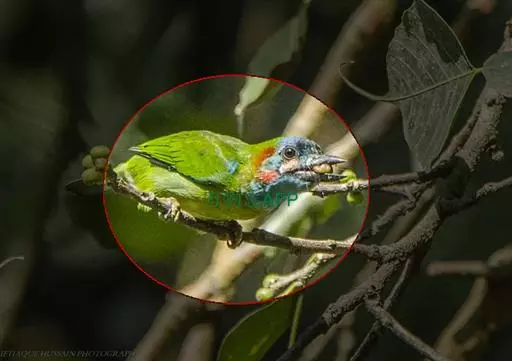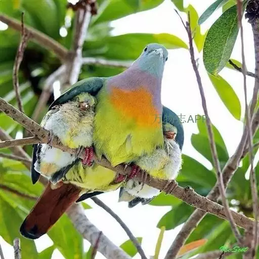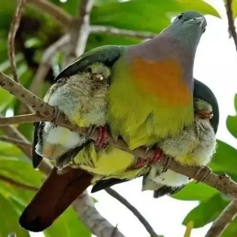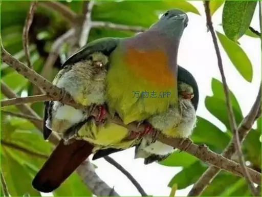 雌鸟上体的绿色部分较雄鸟晦暗,没有栗色而代之以暗绿色,头顶和胸部为淡黄绿色而没有橙色,其余部分与雄鸟相似。