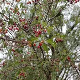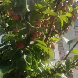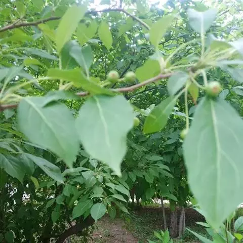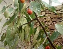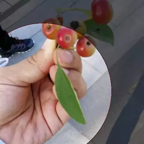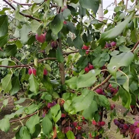 果实近球形,直径1-1.5厘米,红色,萼洼梗洼均下陷,萼片多数脱落,少数宿存。花期4-5月,果期8-9月。