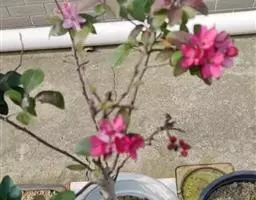 桩景盆栽,取材于野生苍老的树桩,在春季萌芽前采掘,带好宿土,护根保湿。经过1~2年的养护,待树桩初步成型后,可在清明前上盆。初栽时根部要多壅一些泥土,以后再逐步提根,配以拳石,便成具有山林野趣的海棠桩景。新上盆的桩景,要遮阴一个时期后,才可转入正常管理。为使桩景花繁果多,水肥管理应该加强。