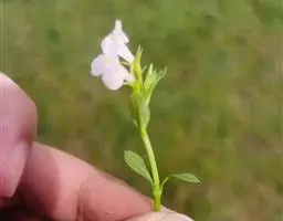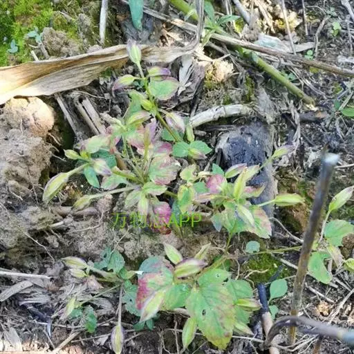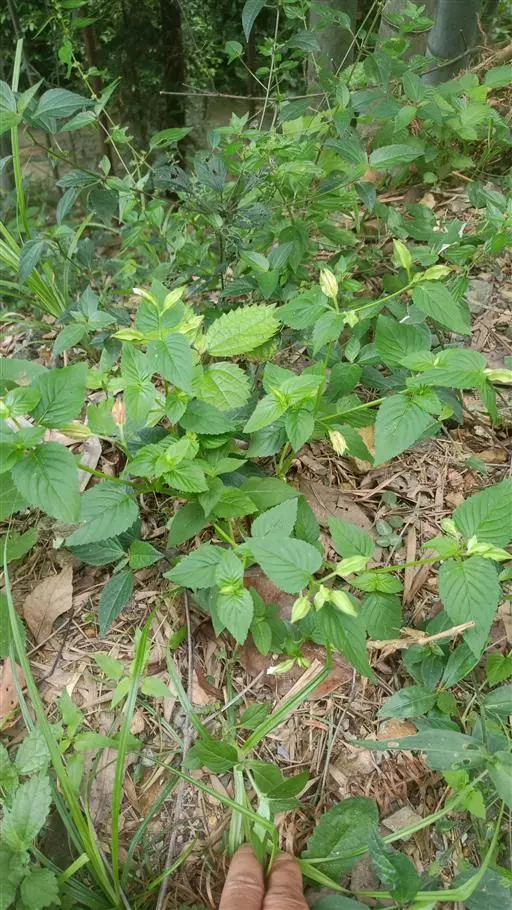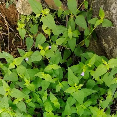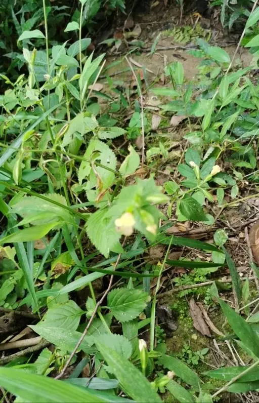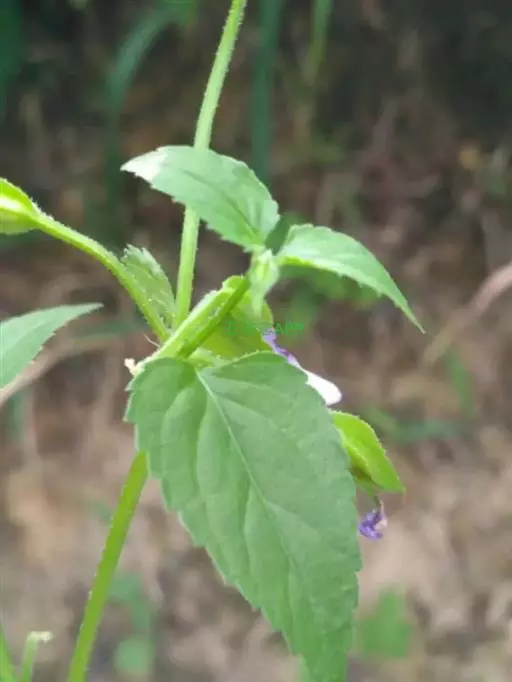 直立或多少外倾,高8-35厘米,自近基部起分枝。叶具长5-20毫米之柄;叶片卵形或长卵形,先端渐尖,基部楔形或多少截形,长2-4厘米,宽1-2厘米,向上逐渐变小,边缘具略带短尖的锯齿,两面疏被柔毛。花具长约1.5厘米之梗,果期梗长可达3厘米,在分枝顶部排成伞形花序或单生叶腋,稀可同时有总状排列的存在;萼矩圆状纺锤形,具5翅,长1.3-1.7厘米,宽0.6-0.8厘米,果期长达2厘米,宽1厘米,翅宽达2.5毫米而略带紫红色,基部圆形,翅几不延,顶部裂成5小齿;花冠长1.5-2.2厘米,其超出萼齿部分仅2-7毫米,淡黄色或白色;上唇多少直立,近于圆形,直径约6毫米;下唇三裂片彼此近于相等,长约3毫米,宽约4毫米,各有1枚蓝紫色斑块,中裂片中央有1黄色斑块,花丝不具附属物。花果期8-11月。 [1-2]