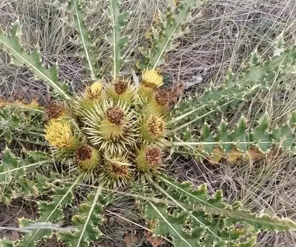 叶莲座状,坚硬,革质,长椭圆形或线状长椭圆形,长20-30厘米, 宽5-8厘米,羽状深裂,叶柄长达10厘米,基部扩大成鞘,中脉在下面突起,粗厚;侧裂片8-11对或奇数,中部侧裂片半长椭圆形或卵状三角形,长2-3厘米,宽1-1.5厘米,侧脉及细脉及中脉在两面明显并在边缘及顶端伸延成长或短针刺,自中部向上或向下的侧裂片渐小,与中部侧裂片同形,边缘及顶端具等针刺。两面异色,上面绿色,无毛,下面灰白色,被密厚的蛛丝状绒毛,叶柄上的绒毛稠密或变稀疏。