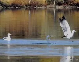 灰背鸥大型水鸟,体长62~69厘米。嘴直,黄色,下嘴先端有红色斑。脚粉红色,头、颈和下体白色,背、…