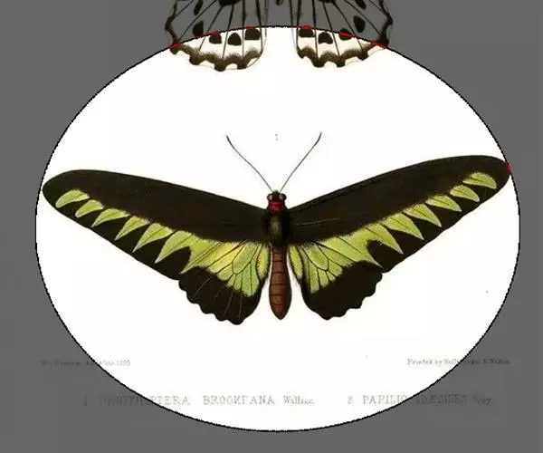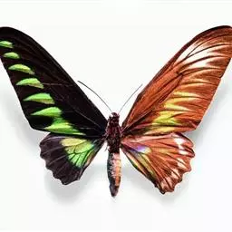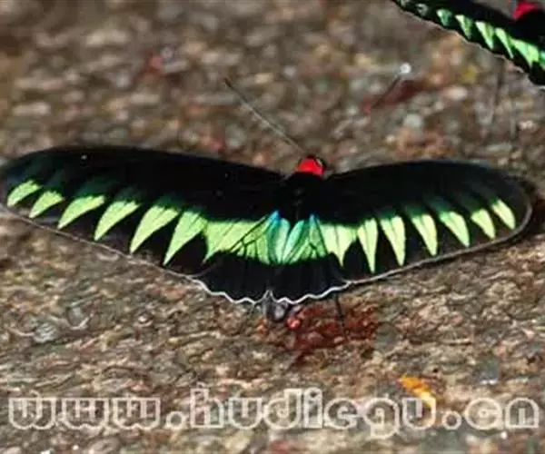 翠叶红颈凤蝶(学名:Trogonoptera brookiana)是凤蝶科红颈凤蝶属的一种大型蝴蝶,该物种共有11个亚种。因其脖子上有一圈红色的绒毛,故称“红颈鸟翼蝶”。也因为翅面上绿色斑纹酷似树木绿色的叶片又名“翠叶凤蝶”。蝶翅上遍布金绿色鳞片,在阳光照射下变幻多彩,显得十分华贵美丽。