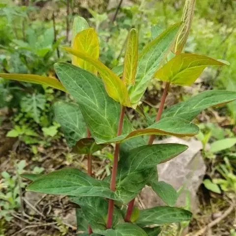 多年生草本,高0.3-0.5米,全体无毛。茎多数,圆柱形,具多数叶,不分枝或有时在上部具腋生小枝。叶无柄,叶片向茎基部者渐变小而靠近,茎最下部者为倒卵形,向茎上部者为卵形或卵状椭圆形,长2-5厘米,宽1-2.5 (-3)厘米,先端钝形且常微缺,基部心形而抱茎,全缘,坚纸质,上面绿色,下面白绿色,散布淡色腺点,侧脉约4对,与中脉在上面凹陷,下面凸起,脉网稀疏,只在下面隐约可见。
