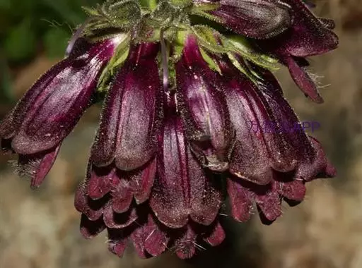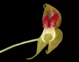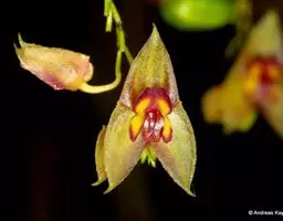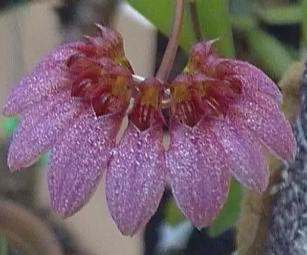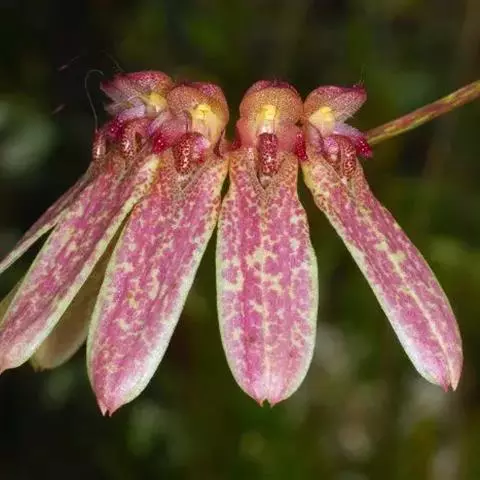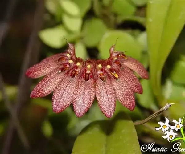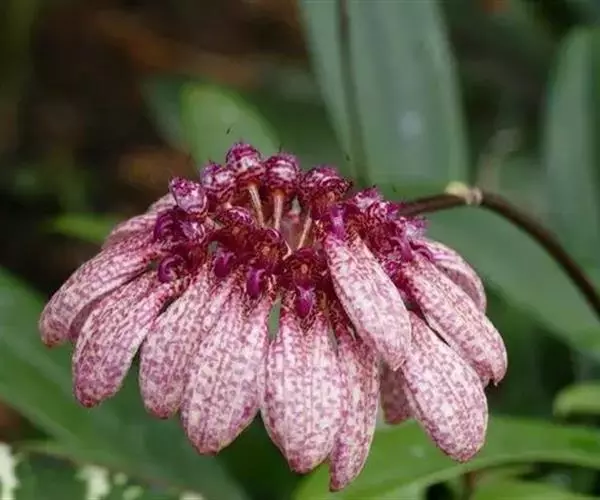 花葶黄绿色带紫红色条斑,从假鳞茎基部抽出,直立,通常长约17厘米,伞形花序具数朵花;花序柄纤细,粗1-2毫米,具长5-10毫米的筒状鞘;花苞片淡黄色带紫色斑点,披针形,长约5毫米,先端急尖;花梗和子房纤细,长约1厘米;花浅白色密布紫红色斑点;中萼片卵状长圆形,凹的,长约5毫米,中部宽约3毫米,具5条带紫红色小斑点的脉,边缘紫红色,近先端处具齿,先端具1条长约3毫米的芒,芒的表面稍粗糙或被细乳突;侧萼片长圆形,比中萼片长3-4倍,基部贴生在蕊柱足上,先端稍钝,基部上方扭转而上下侧边缘除基部和先端外分别彼此粘合,全缘,具5条脉。