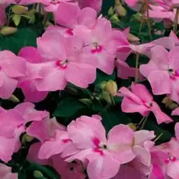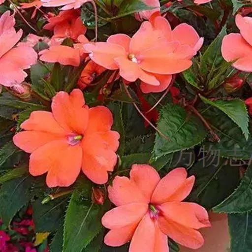 新几内亚凤仙(Impatiens hawkeri W. Bull)多年生常绿草本。茎肉质,分枝多。叶互生,有时上部轮生状,叶片卵状披针形,叶脉红色。花单生或数朵成伞房花序,花柄长,花瓣桃红色、粉红色、橙红色、紫红白色等。花期6--8月。