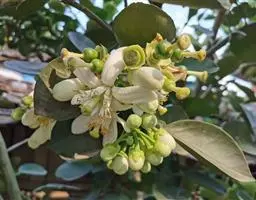 柚的结果枝多为花序果枝,即有叶花序果枝和无叶花序果枝两种类型。有叶花序果枝为带叶的结果枝,除顶端有花外,其他各叶腋也多着生花蕾,或在新梢顶端抽生一总状花序,有叶花序果枝花数4-8朵不等。无叶花序果枝上无叶或仅有1-2片极小叶片,枝上着生3-45朵花不等。