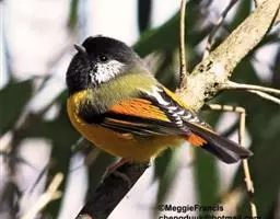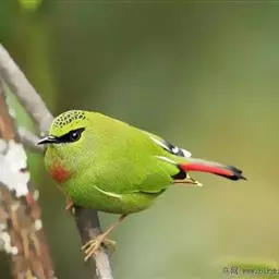 火尾绿鹛是莺科、绿鹛属小型鸟类,体长11-14厘米。上体绿色,头顶至枕具黑色鳞状斑,眼先和眼后黑色,…