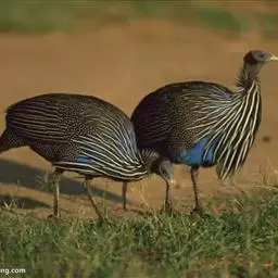 鹫珠鸡:是珠鸡科中体形最大的一种,因头颈部像兀鹫而得名。雌雄羽色相似,为黑色基底上遍布白色点斑,…