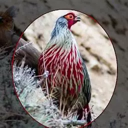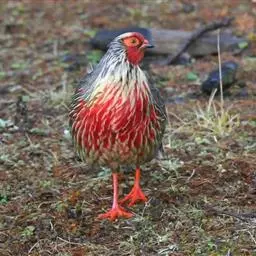 血雉雉科血雉属鸟类,别名血鸡、松花鸡,血雉的雄鸟大覆羽、尾下覆羽、尾上覆羽、脚、头侧、腊膜为红色,…