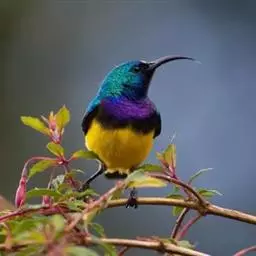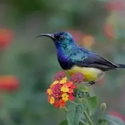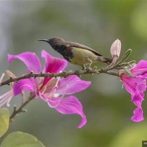 黑胸太阳鸟:小型鸟类,体长9-15厘米。嘴细长而向下曲。雄鸟中央尾羽特长,尾呈楔形,…