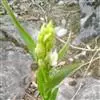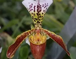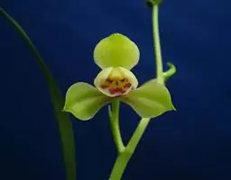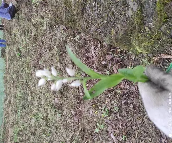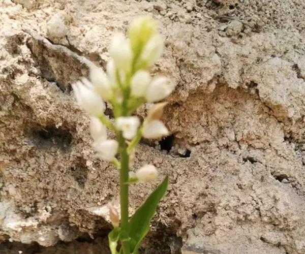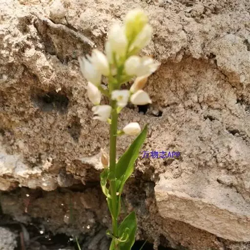 总状花序长1.5-6厘米,具2-13朵花;花苞片线状披针形至狭三角形,长2-6毫米,但最下面1-2枚叶状,长可达5-13厘米;花白色,稍开放或不开放;萼片狭菱状椭圆形或狭椭圆状披针形,长1.1-1.6厘米,宽3.5-4.5毫米,先端渐尖或近急尖,具5脉;花瓣近倒卵形,长7-8毫米,宽约4毫米,先端急尖或具短尖;唇瓣长5-6毫米,3裂,基部具囊;侧裂片近卵状三角形,多少围抱蕊柱;中裂片三角状心形,长3-3.5毫米,宽5-6毫米,上面具3-4条纵褶片,近顶端处密生乳突;唇瓣基部的囊短而钝,包藏于侧萼片基部之内;蕊柱长4-5毫米。