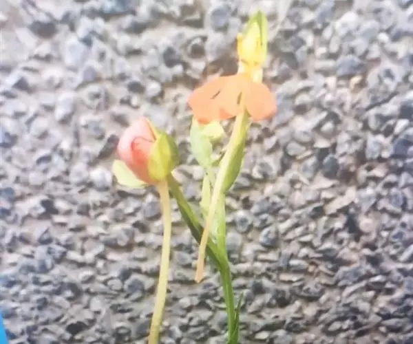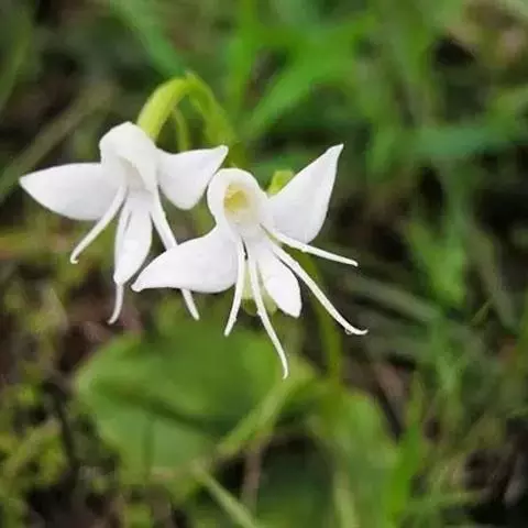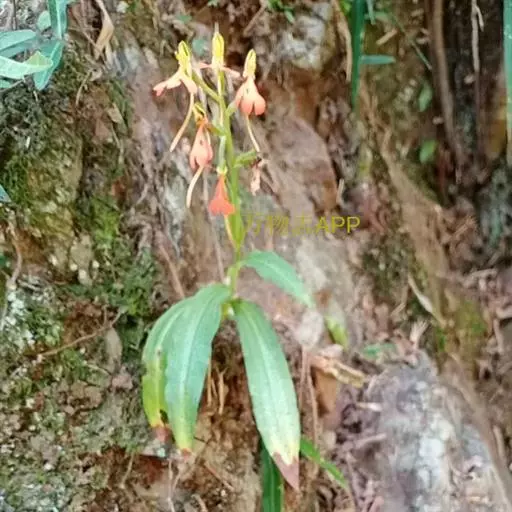 总状花序具2-10余朵疏生的花,长3-8厘米,花茎无毛;花苞片卵状披针形,长1.5-1.7厘米,先端渐尖,短于子房;子房圆柱形,扭转,无毛,连花梗长2-3厘米;花中等大,萼片和花瓣绿色,唇瓣橙黄色、橙红色或红色;中萼片直立,近圆形,凹陷,长约9毫米,宽约8毫米,先端钝,具3脉,与花瓣靠合呈兜状;侧萼片长圆形,长9-10毫米,宽约5毫米,反折,先端钝,具5脉;花瓣直立,匙状线形,长约8毫米,宽约2毫米,先端钝,具1脉;唇瓣向前伸展,轮廓卵形,长1.8-2厘米,最宽处约1.5厘米,4裂,基部具短爪,侧裂片长圆形,长约7毫米,宽约5毫米,先端钝,开展;中裂片2裂,裂片近半卵形,长约4毫米,宽约3毫米,先端为斜截形;距细圆筒状,污黄色,下垂,长2-3厘米,直径约1毫米,末端通常向上弯;蕊喙大,三角形,具延长的臂;柱头2个,隆起,棒状,稍弯曲,长约2.5毫米。
