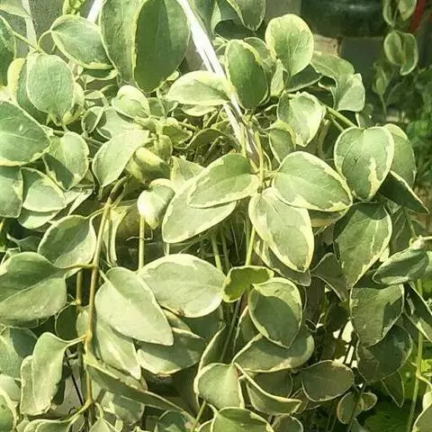 蔓性半灌木。矮生、枝条蔓性、匍匐生长,长达2米以上。叶椭圆形或卵形,先端急尖,对生,有叶柄,亮绿色,有光泽,叶缘乳黄色,分蘖能力十分强。高脚蝶状花冠,花单生,紫罗兰色。经过引种栽培试验,发现它适应性强,对土壤要求不严,生长快。夹竹桃科蔓长春花属蔓长春花的变种。 花叶蔓长春
