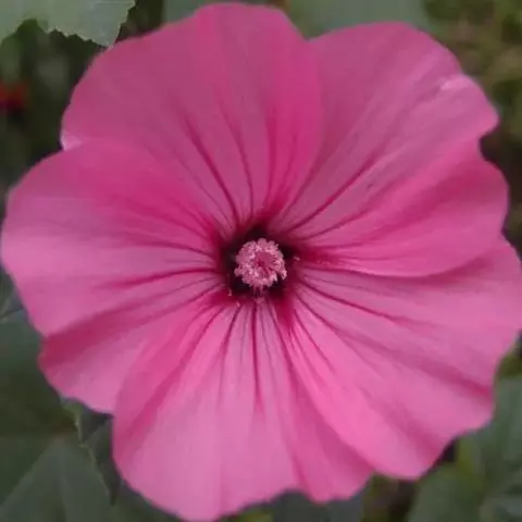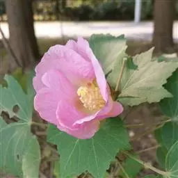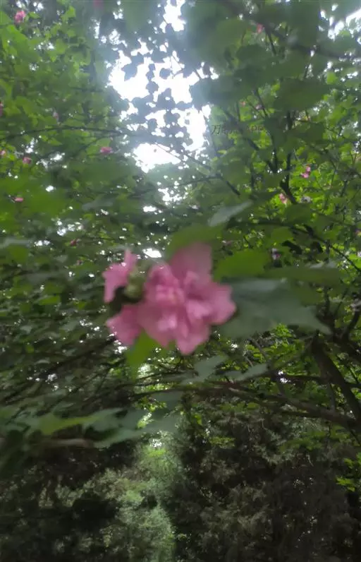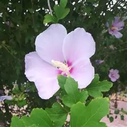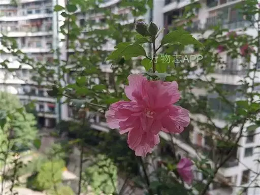 木槿(原变种):落叶灌木,高3-4米,小枝密被黄色星状绒毛。叶菱形至三角状卵形,长3-10厘米,宽2-4厘米,具深浅不同的3裂或不裂,先端钝,基部楔形,边缘具不整齐齿缺,下面沿叶脉微被毛或近无毛;叶柄长5-25毫米,上面被星状柔毛;托叶线形,长约6毫米,疏被柔毛。花单生于枝端叶腋间,花梗长4-14毫米,被星状短绒毛;小苞片6-8,线形,长6-15毫米,宽1-2毫米,密被星状疏绒毛;花萼钟形,长14-20毫米,密被星状短绒毛,裂片5,三角形;花钟形,淡紫色,直径5-6厘米,花瓣倒卵形,长3.5-4.5厘米,外面疏被纤毛和星状长柔毛;雄蕊柱长约3厘米;花柱枝无毛。蒴果卵圆形,直径约12毫米,密被黄色星状绒毛;种子肾形,背部被黄白色长柔毛。花期7-10月。