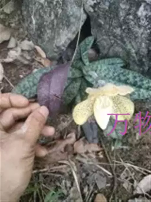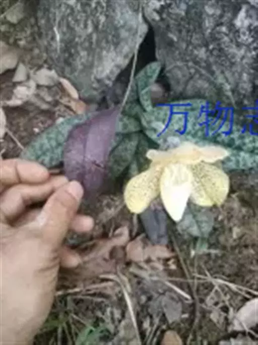 地生或半附生植物,具粗短的根状茎和少数稍肉质而被毛的纤维根。叶基生,二列,4-6枚;叶片狭椭圆形至椭圆状长圆形,长7-18厘米,宽3.5-4.5厘米,先端钝并略有不对称,上面有深浅绿色(或有时略带灰色)相间的网格斑,背面具极密集的紫点或几乎完全紫色,中脉在背面呈龙骨状突起,基部收狭成叶柄状并对折而彼此套叠。