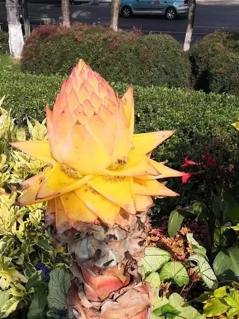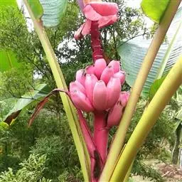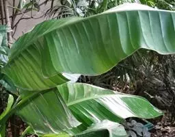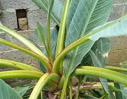 红蕉,假茎高1-2米。叶片长圆形,长1.8-2.2米,宽68-80厘米,叶面黄绿色,叶背淡黄绿色,…