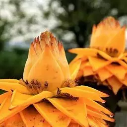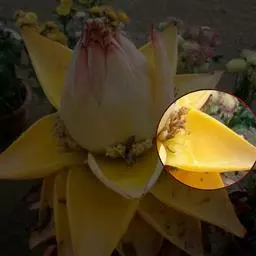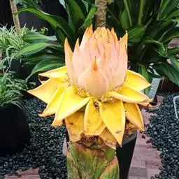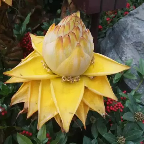 紫苞芭蕉形如一枝亭亭玉立、含苞待放的荷花,但却开在高高的芭蕉树上,这就是紫苞芭蕉。