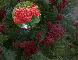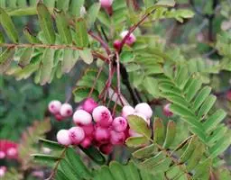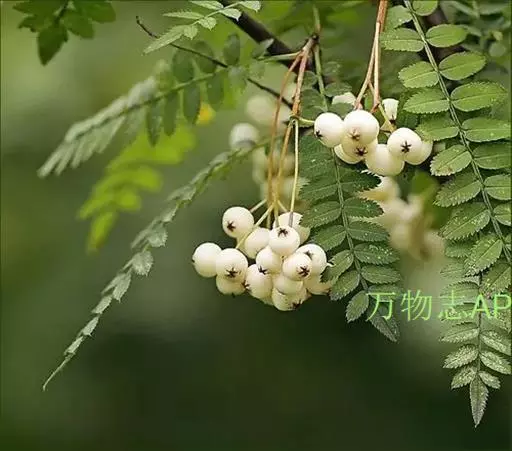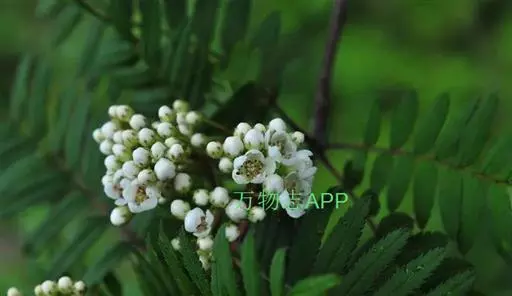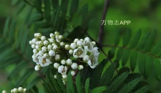 观叶观花观果落叶灌木或小乔木,高达5米,小枝红褐色至灰黑色。冬芽长卵形,外被柔毛。羽状复叶,小叶17~25个,连柄长10~14厘米,小叶近无柄,长圆形至长圆披针形,长1.3~3厘米,宽0.4~1厘米,先端渐尖或钝圆,基部斜楔形,每侧有9~14齿,表面无毛,背面灰绿色,叶轴上有浅沟,两侧有窄翅。叶柄长1~2厘米,托叶圆卵形,早落。复伞房花序,直径4~8厘米,花多数,花直径8~10毫米,萼被疏毛,花瓣卵圆形,4毫米,白色。雄蕊20枚,长为花瓣的1/3,花药褐色,花柱5个,基部具柔毛,与雄蕊等长。果球形,白色,直径6~8毫米,萼片微闭合。