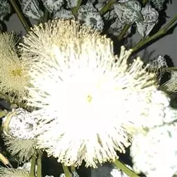 花大,宽4mm,单生或2-3朵聚生于叶腋内;无花梗或极短;萼管倒圆锥形,长1cm,宽1.3cm,表面有4条突起棱角和小瘤状突,被白粉;帽状体稍扁平,中部为圆锥状突起,比兽管短,2层,外层平滑,早落;雄蕊长8-13mm,多列,花丝纤细,花药椭圆形;花柱长7-8mm,粗大。