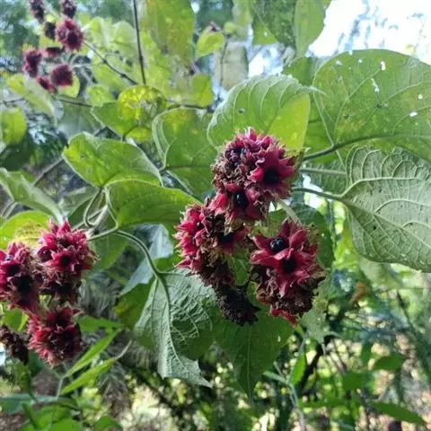 核果倒卵形,直径7-10毫米,略有纵沟,多汁液,内有4分核,外果皮黄灰色,花萼宿存。花果期3-12月。