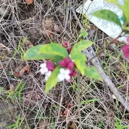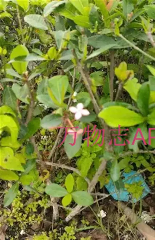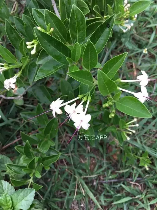 叶对生,薄革质,卵形、椭圆形或椭圆状披针形、卵状披针形,长3-7厘米,宽1.5-4.5厘米,顶端钝尖,基部楔形或宽楔形,全缘,常略反卷,表面深绿色,背面淡绿色,无毛或背面沿脉疏生短柔毛,两面都散生黄色细小腺点,干后褪色或脱落而形成小浅窝,侧脉4-7对,近叶缘处向上弯曲而相互汇合;叶柄长约1厘米;聚伞花序通常由3朵花组成,少为2次分歧,着生于叶腋或枝顶叶腋;花很香,花序梗长2-4厘米;苞片线形,长约2毫米,对生或近于对生;花萼钟状,外被细毛,顶端微5裂或在果时几平截,萼管长约7毫米;花冠白色,顶端5裂,裂片长椭圆形,长约7毫米,花冠管长2-3厘米,外面几无毛,有不明显的腺点,内面密生绢状柔毛;雄蕊4,偶见6,花丝紫红色,细长,与花柱同伸出花冠,花柱较花丝长或近等长,柱头2裂。