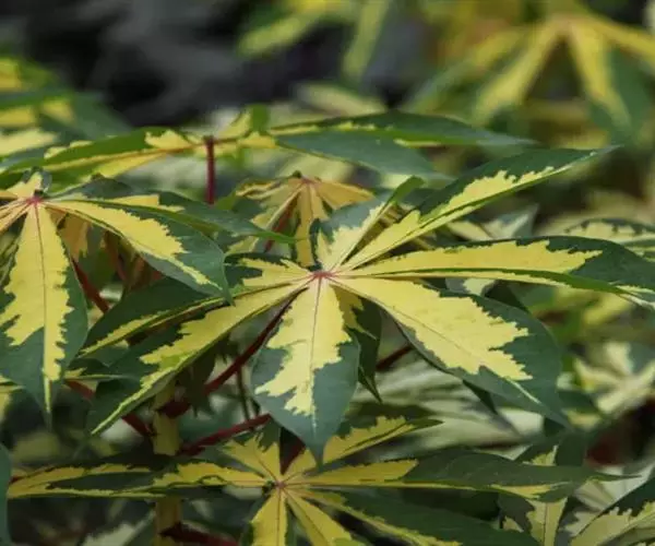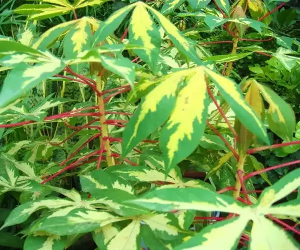 花叶木薯叶片掌状深裂,绿色叶面镶嵌黄色斑块,红色叶柄,显得十分绚丽,是非常耐看的观叶植物。