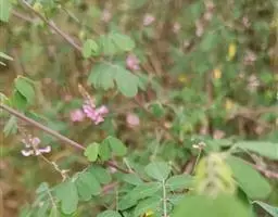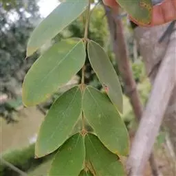叶长10-15厘米;叶轴及叶柄呈扁四方形,在叶轴上面最下2或3对小叶之间和叶柄上部有棍棒状腺体2-3枚;小叶7-9对,长椭圆形或卵形,长2-5厘米,宽1-1.5厘米,下面粉白色,被疏散、紧贴的长柔毛,边全缘;小叶柄长1-1.5毫米,被柔毛;托叶线形,弯曲,长约1厘米,早落。