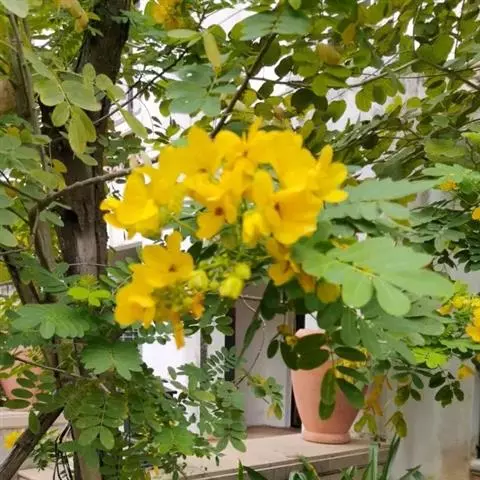 黄槐 灌木或小乔木,高5-7米;分枝多,小枝有肋条;树皮颇光滑,灰褐色;嫩枝、叶轴、叶柄被微柔毛。