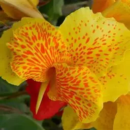 引自南美,是美人蕉属类中少见稀世珍品,因在同一枝花茎上争奇斗艳、开出大红与五星艳黄两种颜色的花而得名,更具观赏价值的是花瓣红黄各半,同株异渲。更奇之处是红花瓣上点缀着鲜黄星点,五星黄花瓣装点着鲜红光斑。双色鸳鸯美人蕉株矮状,叶节密生,叶片大而浓绿,四片叶时即可现蕾开花。是盆栽佳品,也适宜城区、旅游景区、生活区、公园及行道绿化。